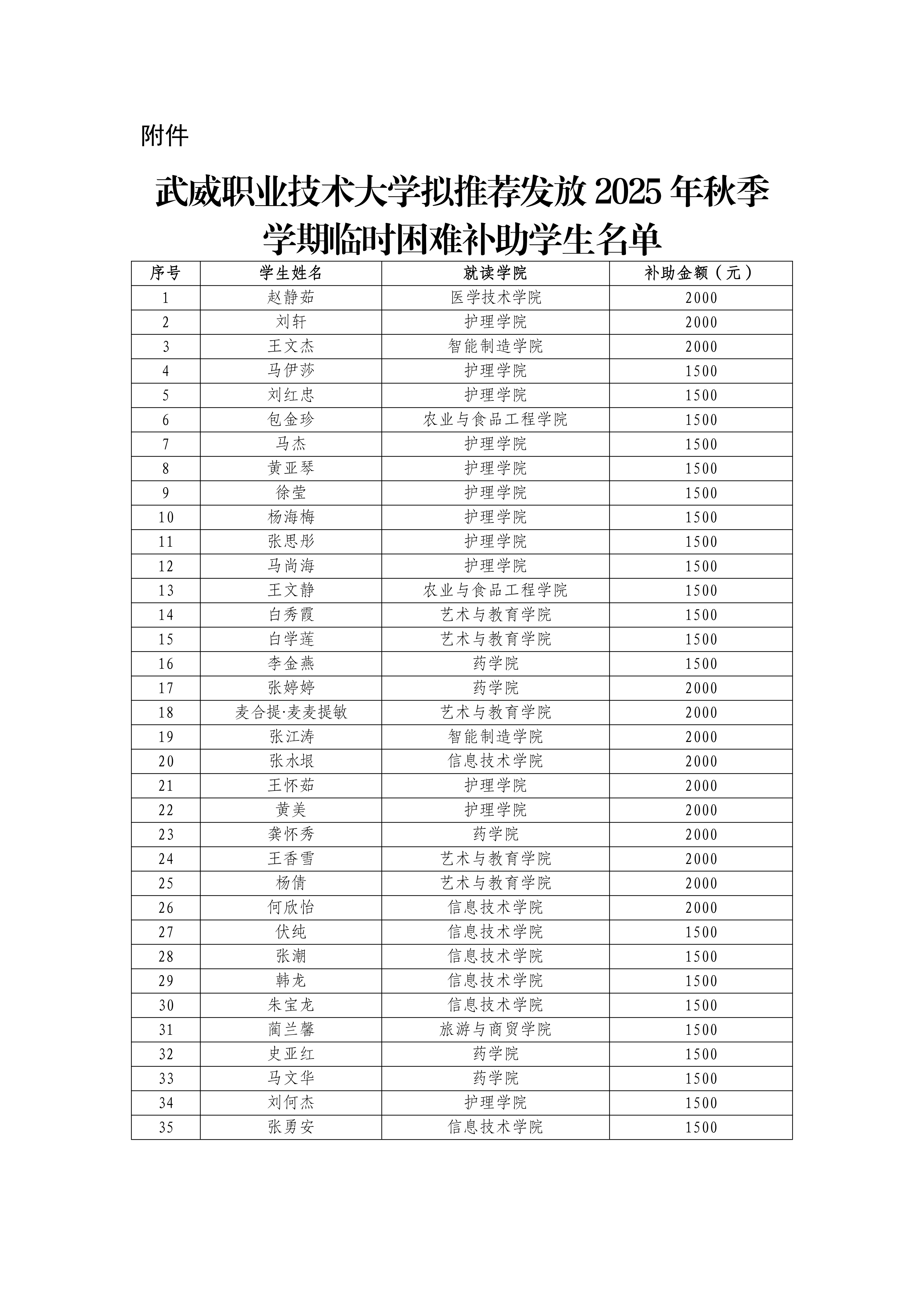 武威職業(yè)技術(shù)大學關(guān)于向趙靜茹35名學生發(fā)放臨時困難補助的公示