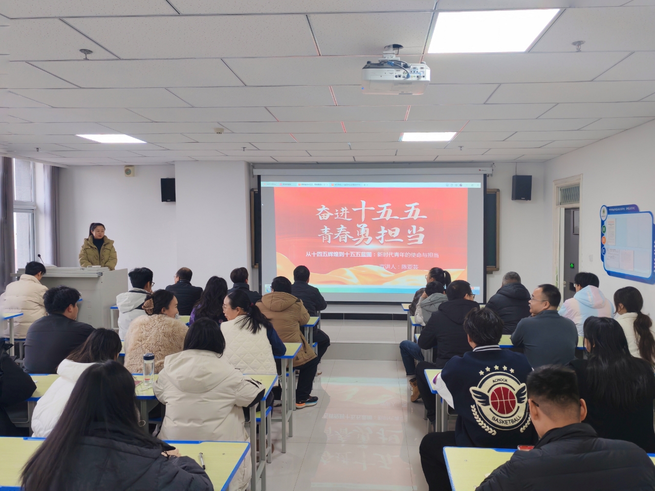 12月11日,學院邀請學校宣講組成員、馬克思主義學院教師陳亞蕓在能源科技樓612開展專題宣講,全體黨員、教職工、入黨積極分子及團學干部參加。陳亞蕓以“奮進十五五,青春勇?lián)敗睘橹黝},回顧了“十四五”時期國家發(fā)展取得的歷史性成就,深入解讀了“十五五”規(guī)劃的核心要義與黨的二十屆四中全會精神的實踐要求。結(jié)合學院新能源學科特色,她鼓勵全體師生主動擔當生態(tài)文明建設先鋒使命,將“小我”融入“大我”,在服務國家戰(zhàn)略、奉獻社會發(fā)展的生動實踐中書寫青春華章。