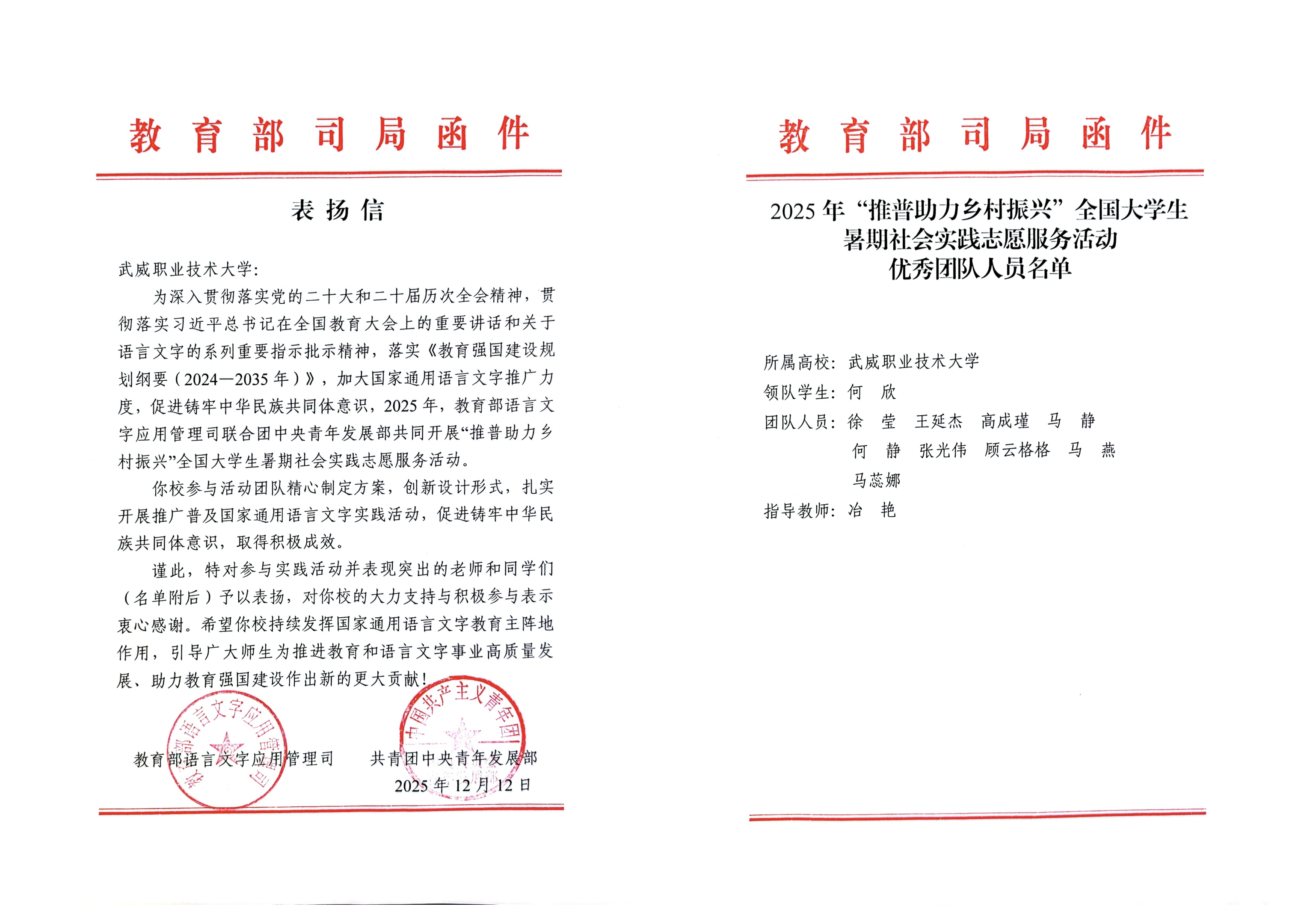 喜報(bào)!武威職業(yè)技術(shù)大學(xué)“推普助力·鄉(xiāng)村振興”暑期社會(huì)實(shí)踐團(tuán)隊(duì)獲評(píng)全國(guó)優(yōu)秀團(tuán)隊(duì)