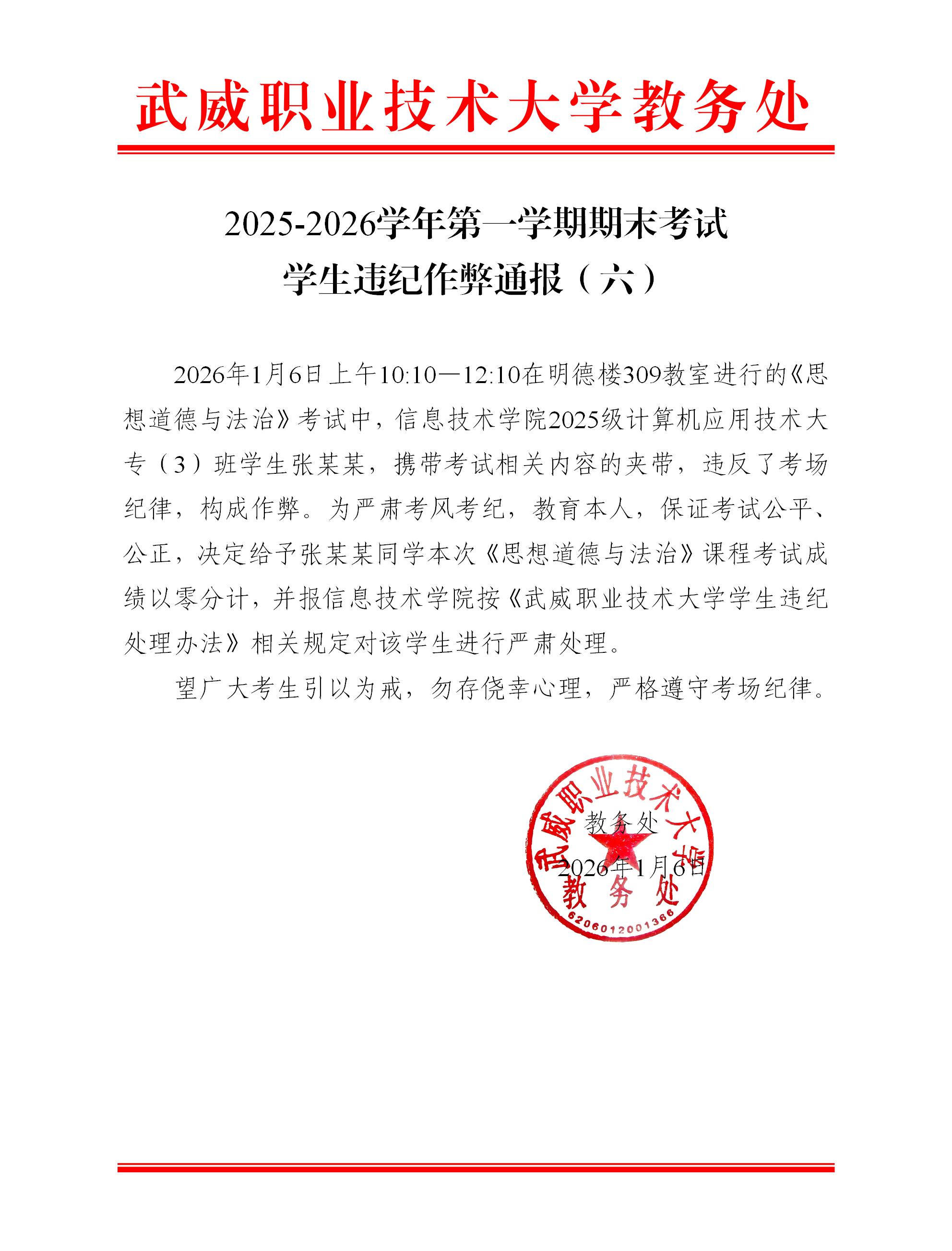 2025-2026學年第一學期期末考試學生違紀作弊通報(六)