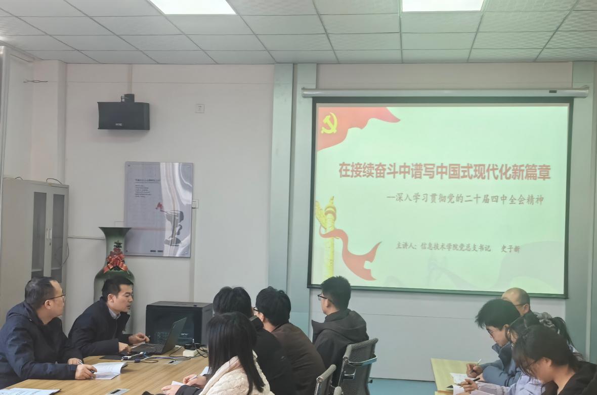 為深入學(xué)習(xí)貫徹黨的二十屆四中全會精神,引導(dǎo)學(xué)院教師深刻把握其重大意義與核心要義,凝聚奮進力量,近日,信息技術(shù)學(xué)院黨總支書記為全體教師講授了題為“在接續(xù)奮斗中譜寫中國式現(xiàn)代化新篇章”的專題黨課。