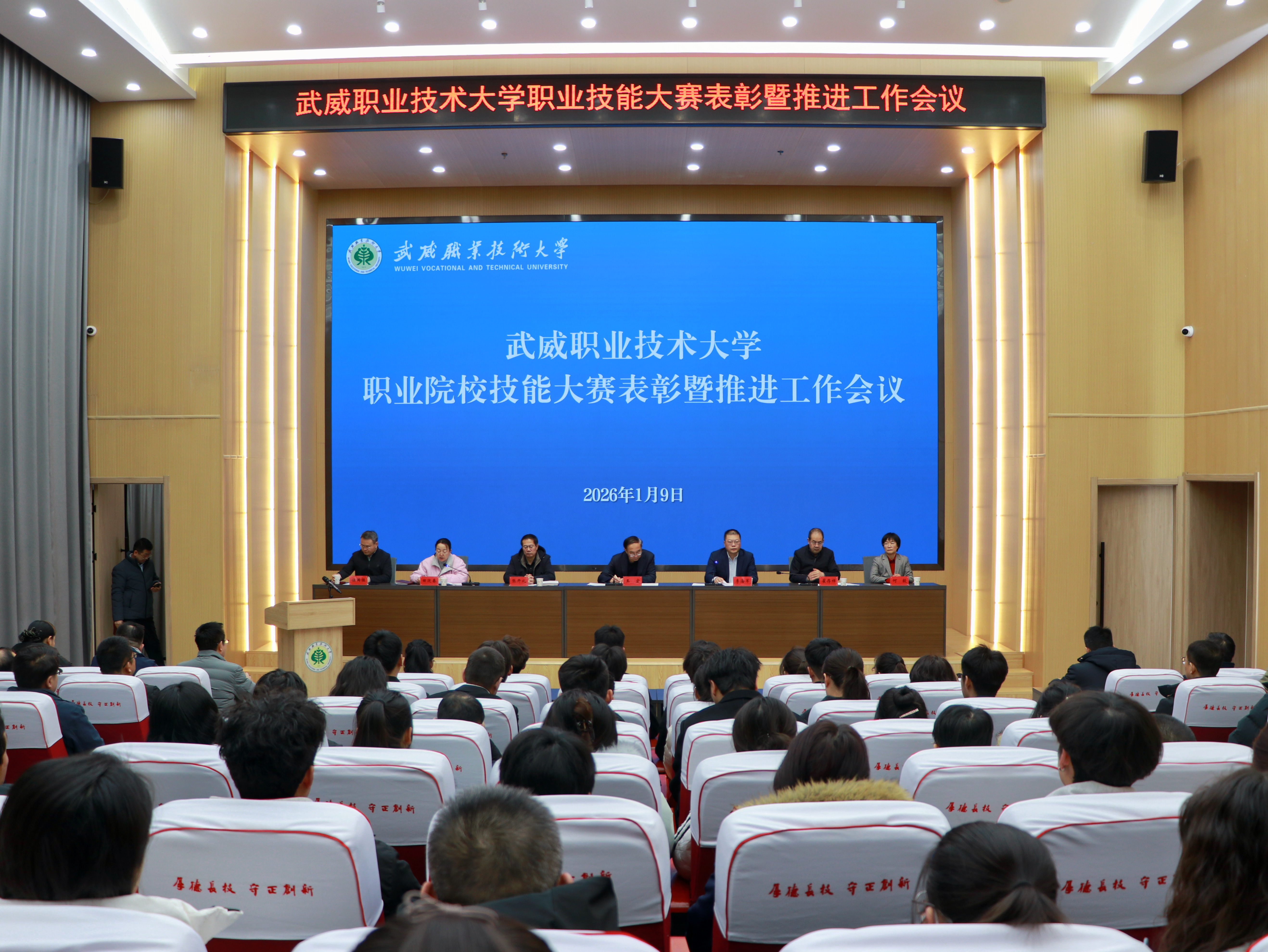 1月9日,武威職業(yè)技術大學召開職業(yè)院校技能大賽表彰暨推進工作會議。黨委書記王宏出席會議并講話。在家校領導班子成員、各學院(部)及職能部門負責人、獲獎師生代表以及備戰(zhàn)2026年大賽的師生代表共同參會。校長李海軍主持會議。