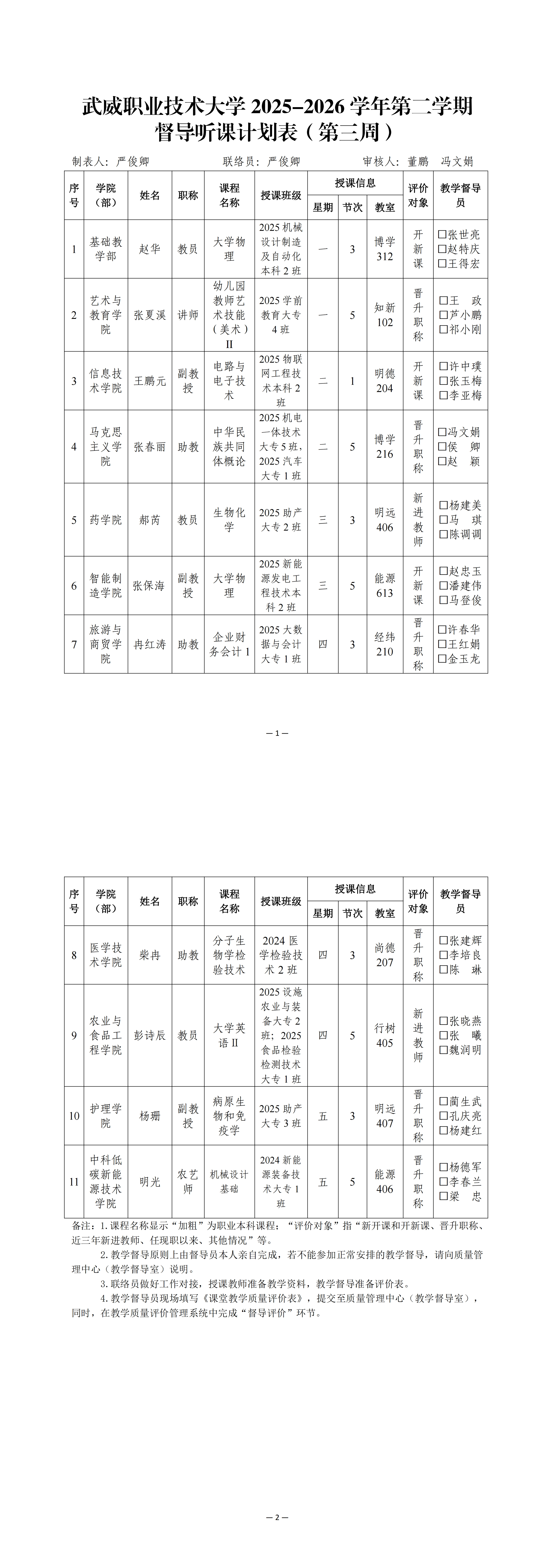 武威職業(yè)技術(shù)大學(xué)2025-2026學(xué)年第二學(xué)期督導(dǎo)聽課計劃表(第一周)